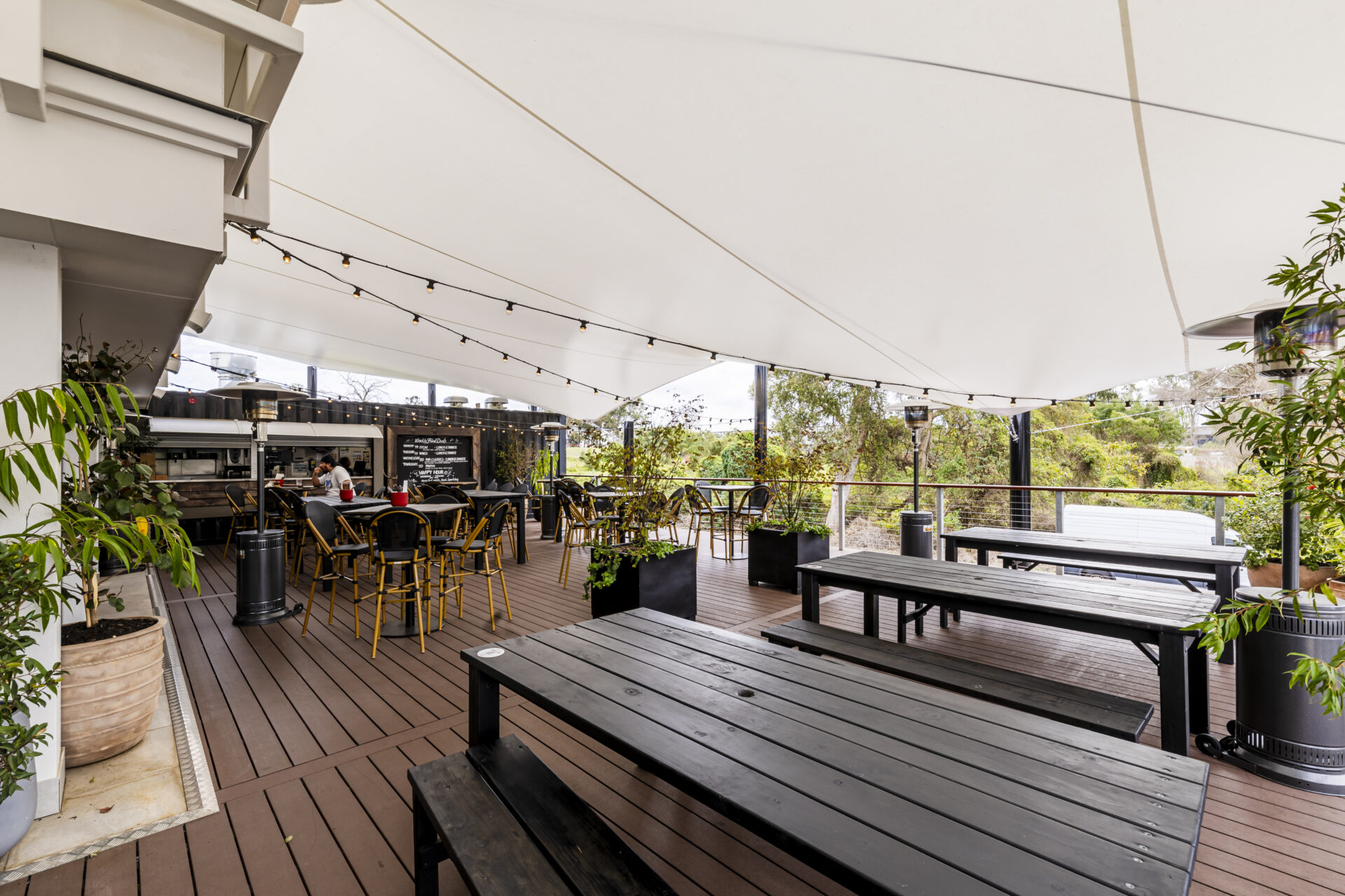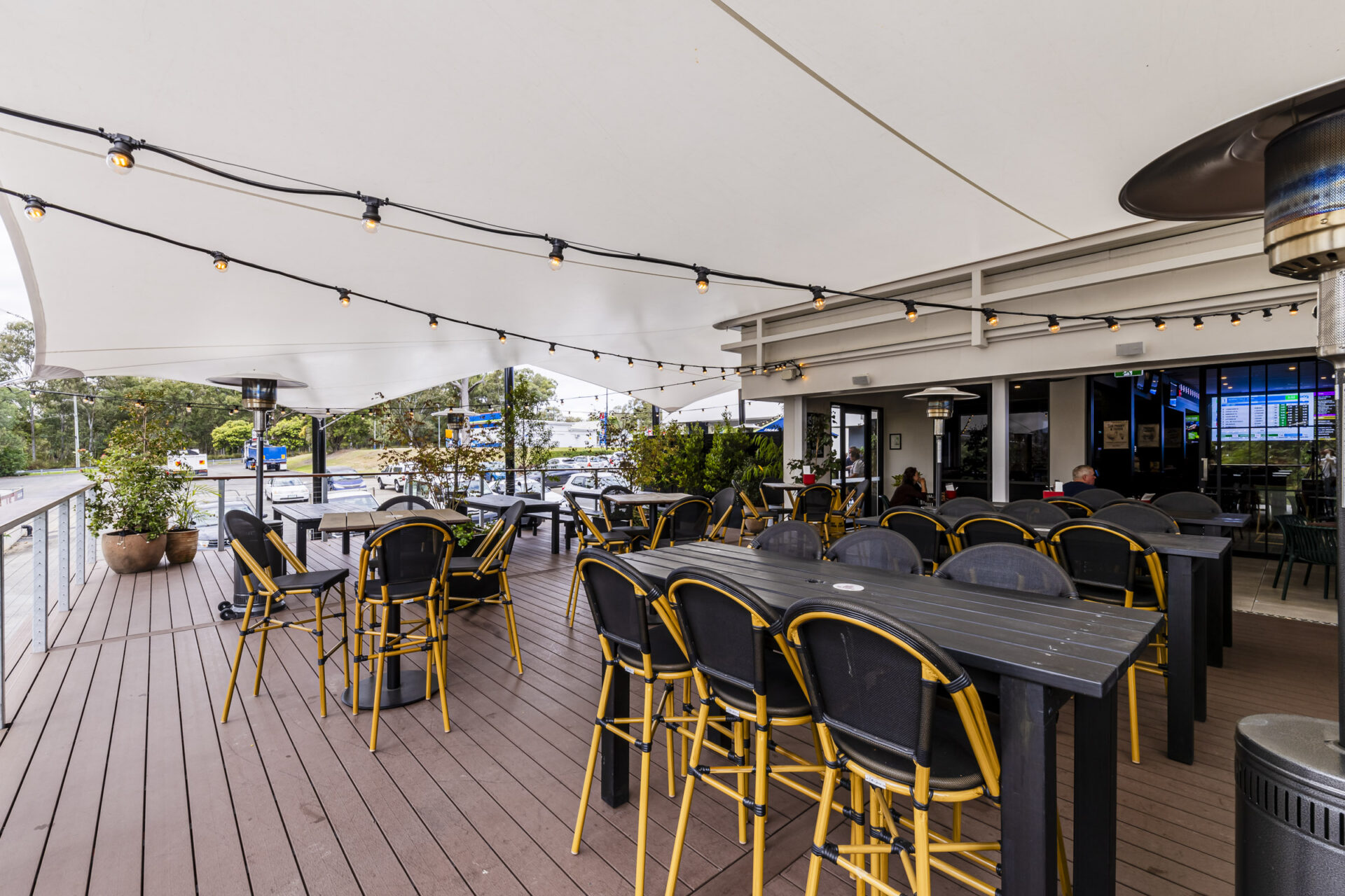 A spacious semi-private setting, the Outdoor Deck at Inala Hotel is ideal for relaxed functions and social gatherings. Accommodating up to 80 guests seated or 120 standing, this area features weatherproof sail coverage for year-round comfort. With in-house music only due to licensing restrictions, this space is best suited to casual events without external entertainment or speakers.